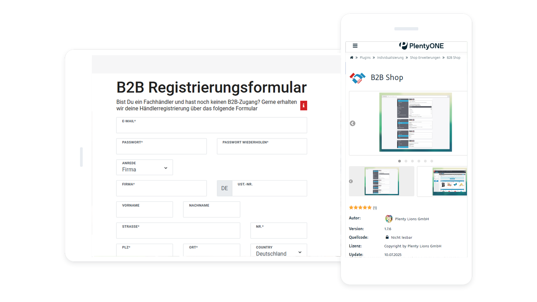 Mit dem B2B Plugin steuern Sie den Zugriff auf Preise und Inhalte des Shops anhand der Kundenklasse. Ihre B2B Kunden können im Rahmen der Registrierung Dateien hochladen und Sie können sich per E-Mail informieren lassen.